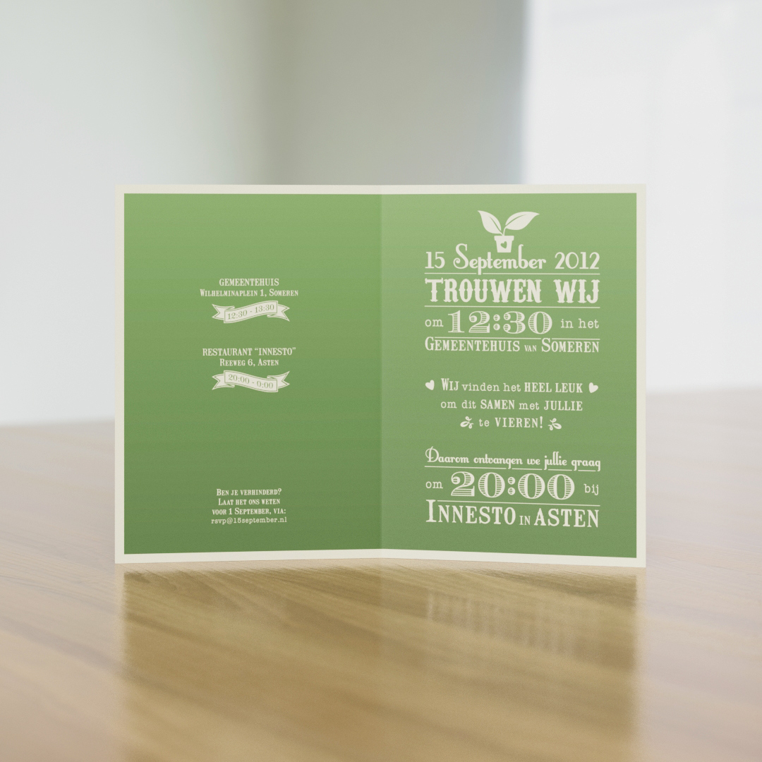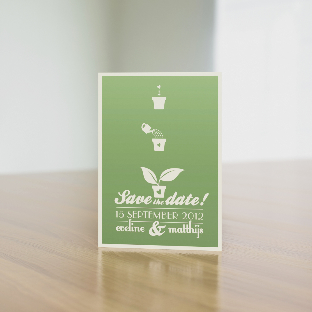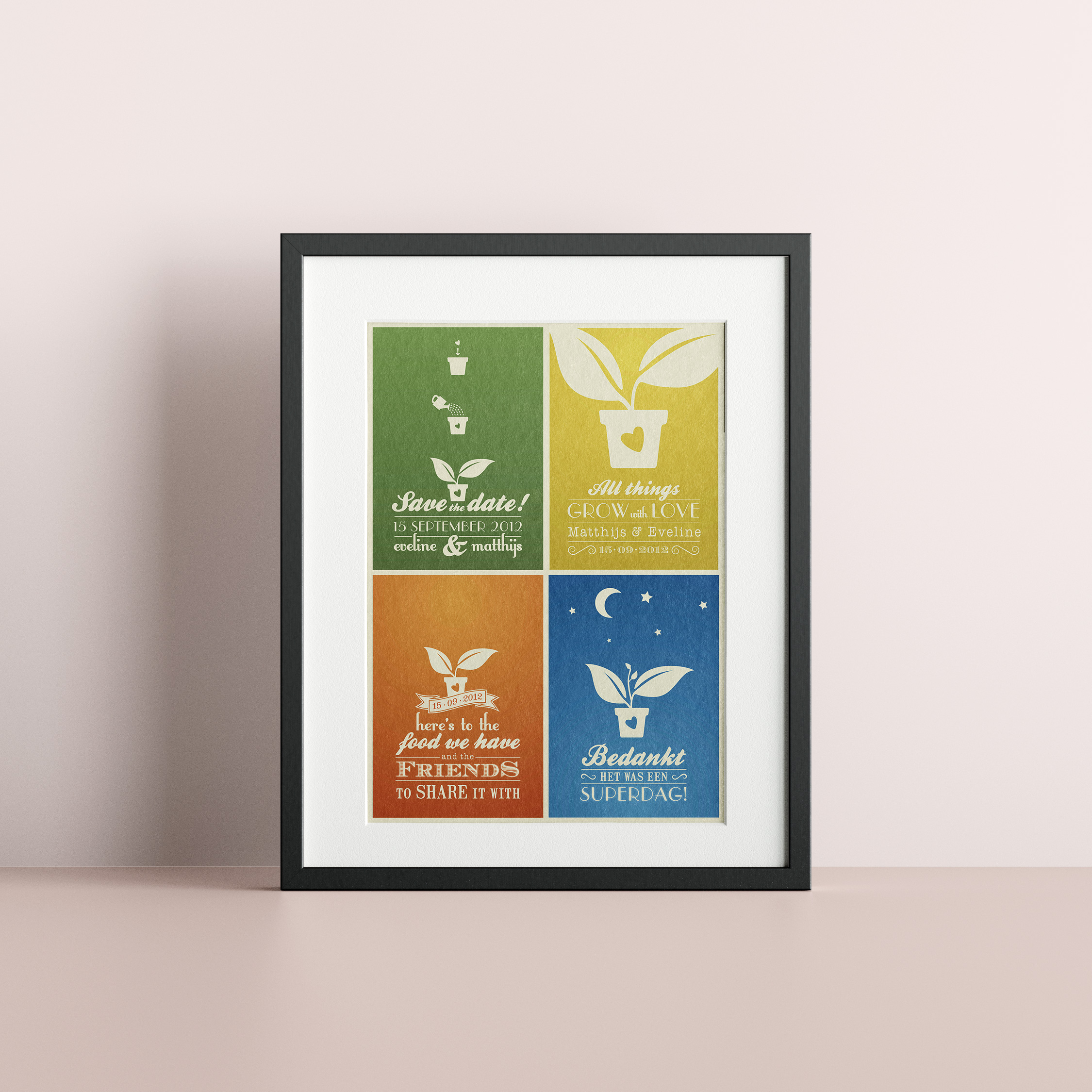 Trouwkaartontwerp aan de hand van het thema “All things grow with love”. Romantisch maar toch strak en modern. Op elk onderdeel (save the date, uitnodiging etc.) komt het logo van het potje met een zaadje, en later een plantje, terug en elk onderdeel heeft zijn eigen kleur.