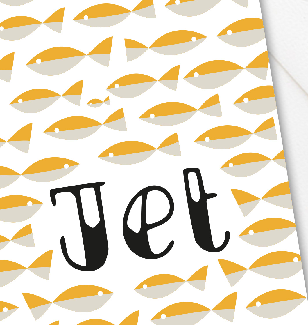 Voor Jet maakten we dit vrolijke kaartje met visjes. In ons eerste gesprek lieten de ouders van Jet ons zien wat voor stijl kaartjes ze mooi vonden en vertelden dat ze heel graag vissen en okergeel in het kaartje verwerkt wilden hebben. Hiermee gingen we aan de slag en maakten een aantal verschillende ontwerpen voor ze klaar. Aan de hand daarvan kozen ze voor dit kaartje vol visjes. We kozen voor extra dik papier, een mooie kraft envelop en bijpassende okergele sluitsticker.