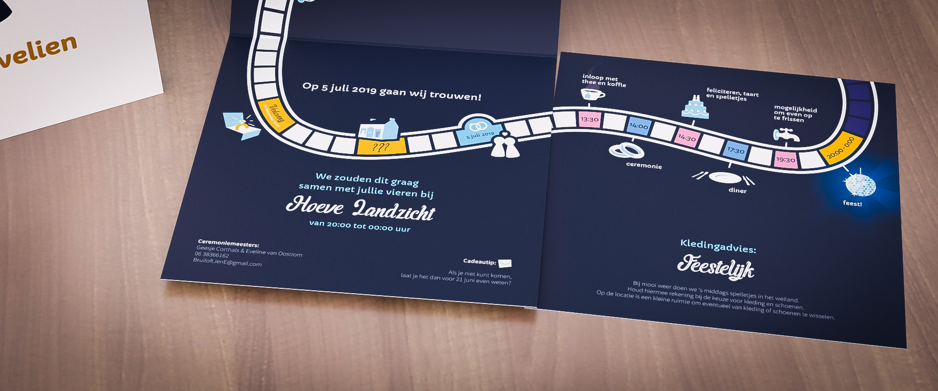 We maakten een klein spelbord binnen in de kaart, met leuke en speciale herinneringen langs de route. Op de bijlage voor de daggasten hebben we het programma in dezelfde stijl vormgegeven en deze kaart past dan ook precies aan de rest van het spelbord!